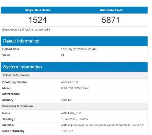 CPU:联发科技Helio P60 Octa核心2.0GHz