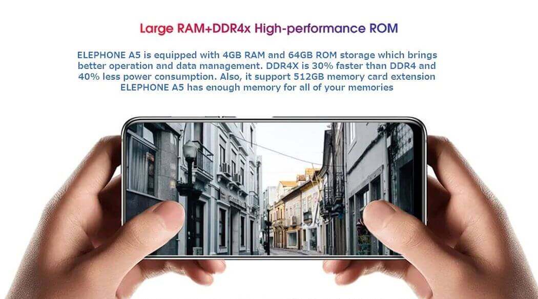 Elephone A5:硬件和性能我们测试中的Elephone A5采用MediaTek的8核处理器Helio P60,8 x 1.8 GHz。 此外还有4 GB的RAM和64 GB的内部存储容量。