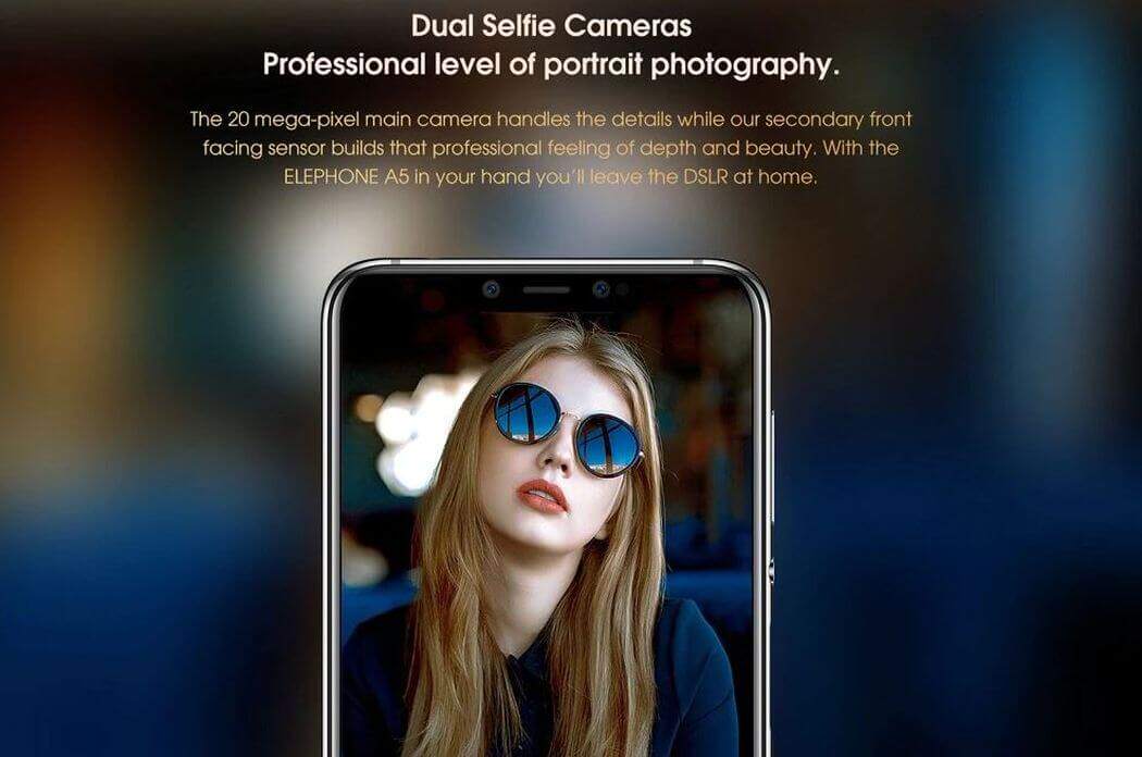 Elephone A5的自拍相机配备了具有20和200万像素传感器的双摄像头(光圈:f / 2.2)。 主摄像头只看起来略微突出外壳.