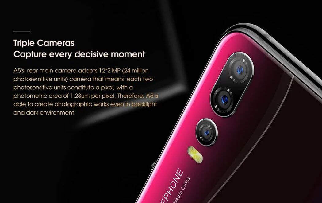 Elephone A5:相机背面是三合一相机,由12,5和30万像素的传感器组成(光圈:f / 2.0)。