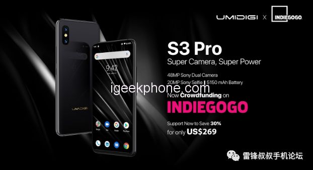 加入集资现在包括Indiegogo节省30%,您可以在lowerest价US $ 269,这绝对是一个特殊的价格为靠山得到UMIDIGI S3 Pro的!不要失去这次机会