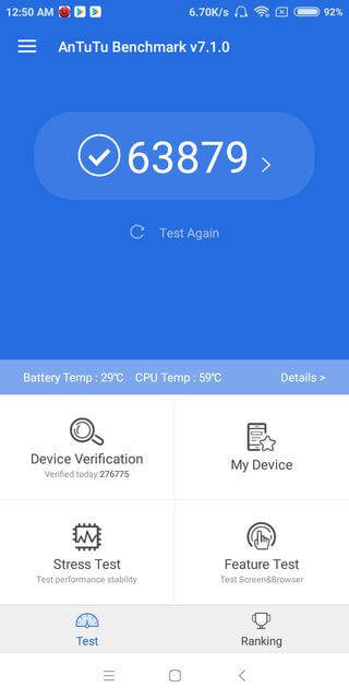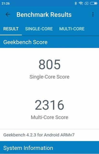 在试验中,这种智能手机在多芯的Geekbench 4接收在AnTuTu的7.1.0 63879点,并在单核测试805点和2316点。