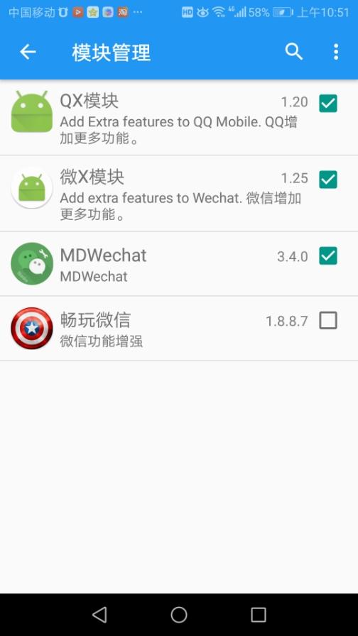 进入模块管理页面,然后勾选你需要使用的 Xposed 模块;如 MDWechat。这里会提示你有版本兼容问题,注意下载和使用对应的版本。