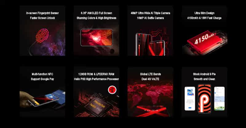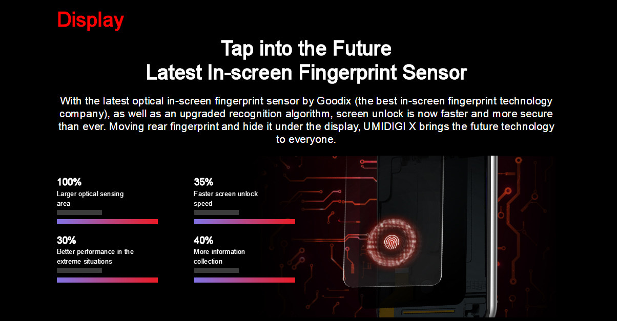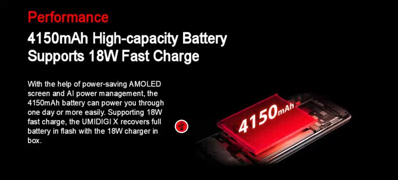 脱颖而出的UMIDIGI X的最大创新就是其6.35英寸AMOLED屏幕,HD +分辨率(1548×720),19.5:9纵横比,水滴形,集成屏下光学指纹传感器。增加了面部识别的生物认证方法。在X设有由Goodix,屏幕指纹模块提供商与华为和小米科技巨头一样 采用最新光学多媒体指纹传感器。此外,这是非常令人印象深刻的是UMIDIGI配备了6.35英寸的AMOLED显示面板,通常 AMOLED显示面板 只用于旗舰手机,由于其鲜艳的色彩表现。联发科的Helio P60的SoC