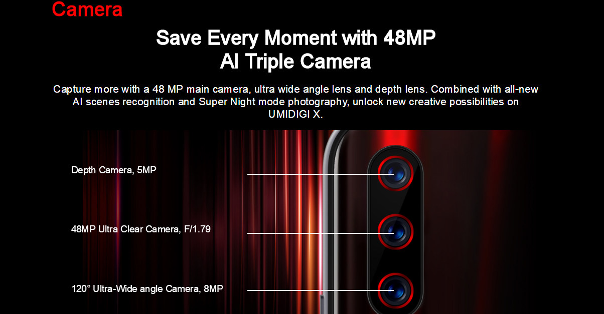 在拍照方面,UMIDIGI X采用置三摄,主摄像头采用48百万像素,使之具有以f / 1.79光圈,8 MP次级传感器具有超广角镜头,(120度)和与采用5 MP传感器的景深相机。此外,它依靠人工智能算法超级夜景模式和场景检测。前摄像机采用16 MP传感器并且还使用AI改善自拍。电池