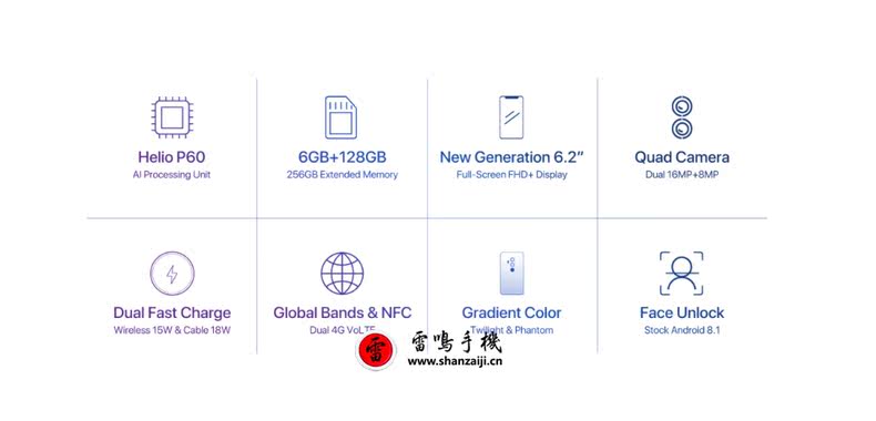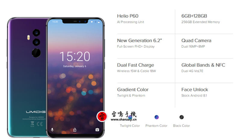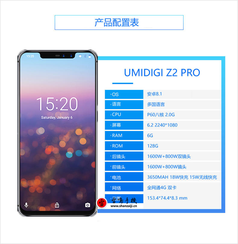 UMI Z2 pro首款采用P60处理器的产品,采用6+128大内存,6.2寸全面屏,类似苹果X一样的齐刘海,支持全网通4G网络,NFC功能,支持18W快充,以及无线快充.