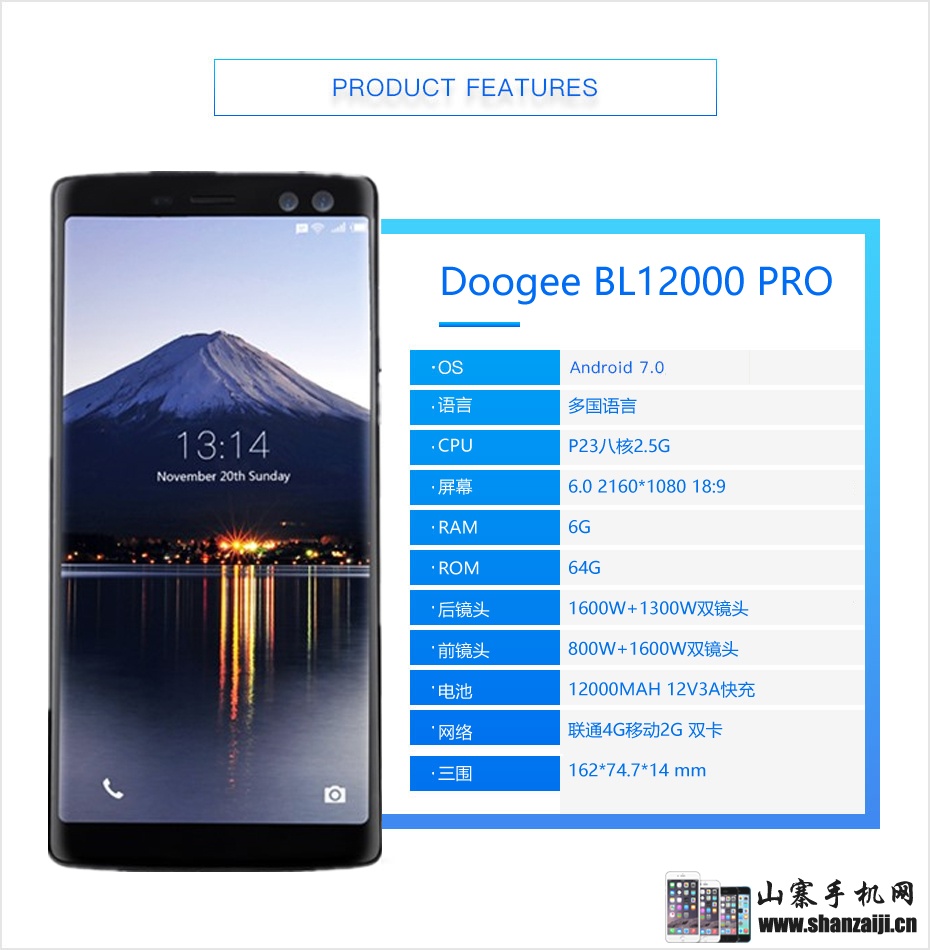 Doogee BL 12000是最好的手机,具有12000mah的超长续航能力。 它拥有一个双摄像头,可以拍出非凡的画面,Doogee BL拥有理想的外形和持久的续航。