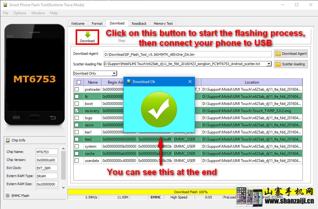 6. Click on the Download button and connect your phone to a USB port of your computer. The flashing process will start automatically and it needs just a few seconds.*