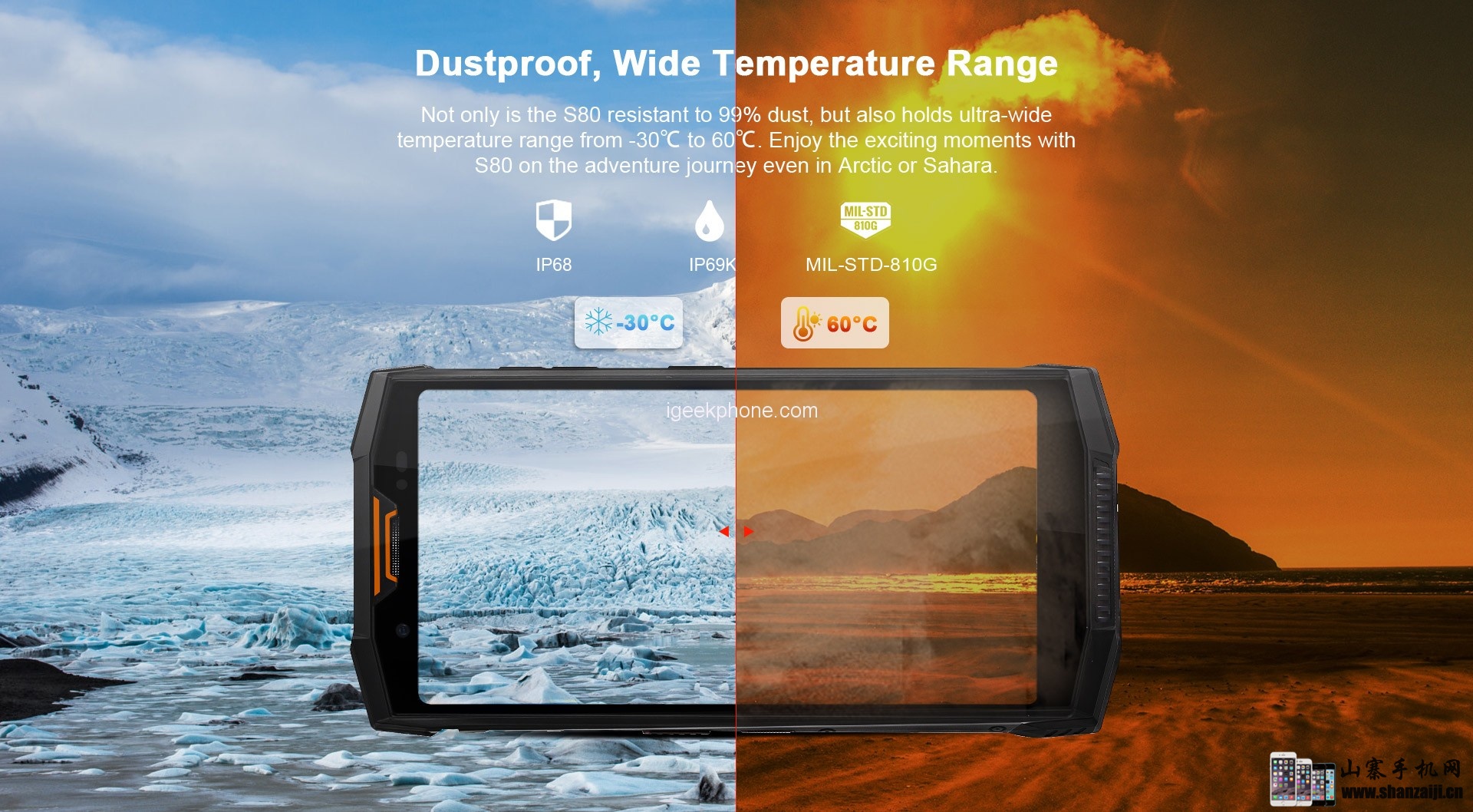 除了防水防尘外,智能手机还能够从6英尺(182厘米)的高度坠落,下车,沐浴油,温度从-30°C到+ 60°C - 所有没有对效率的灾难性后果。器件对环境影响稳定性的全套标准如下:IP68,IP69K,MIL-STD-810G。你可以说,Doogee S80将在其拥有者能够生存的任何地方生存。
