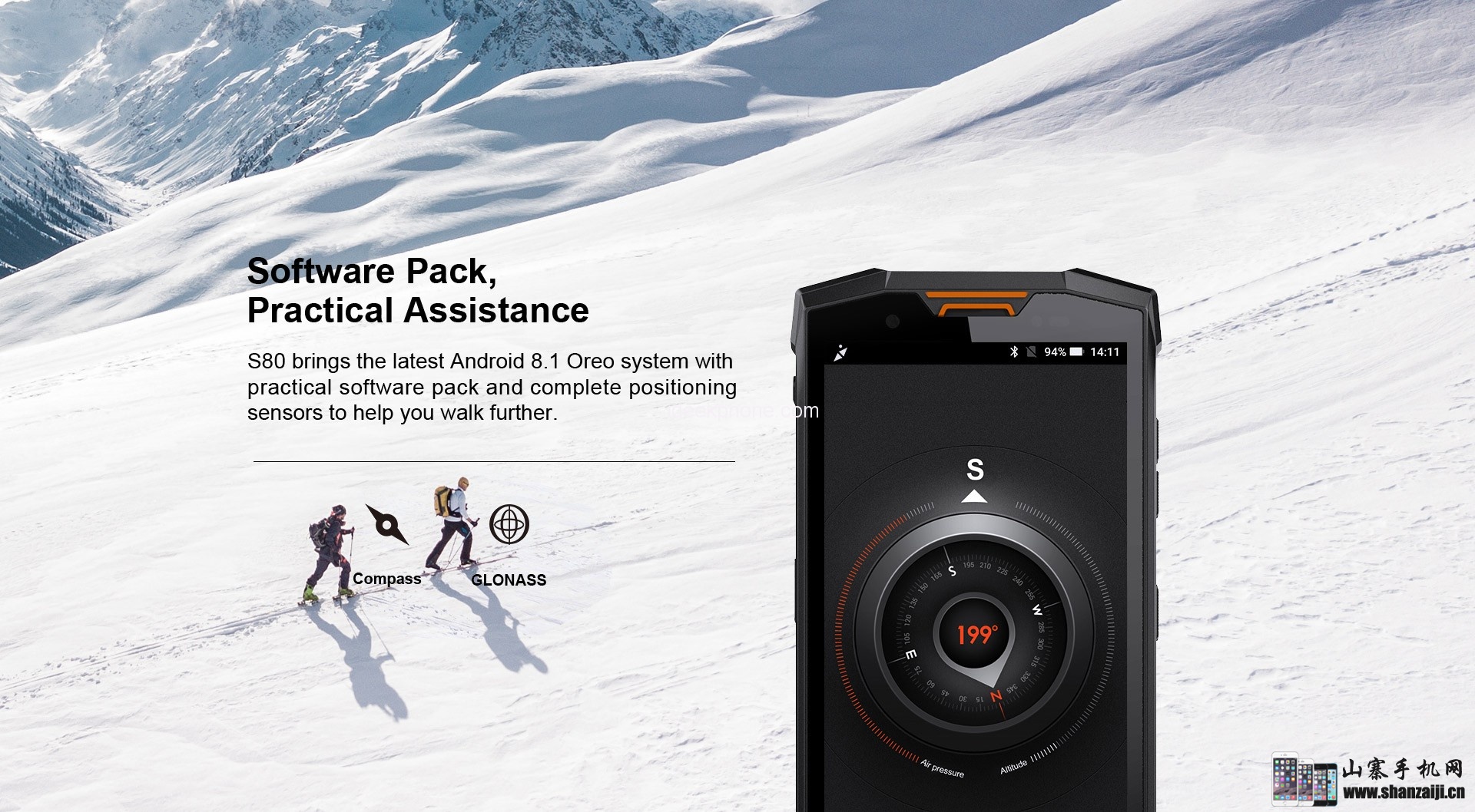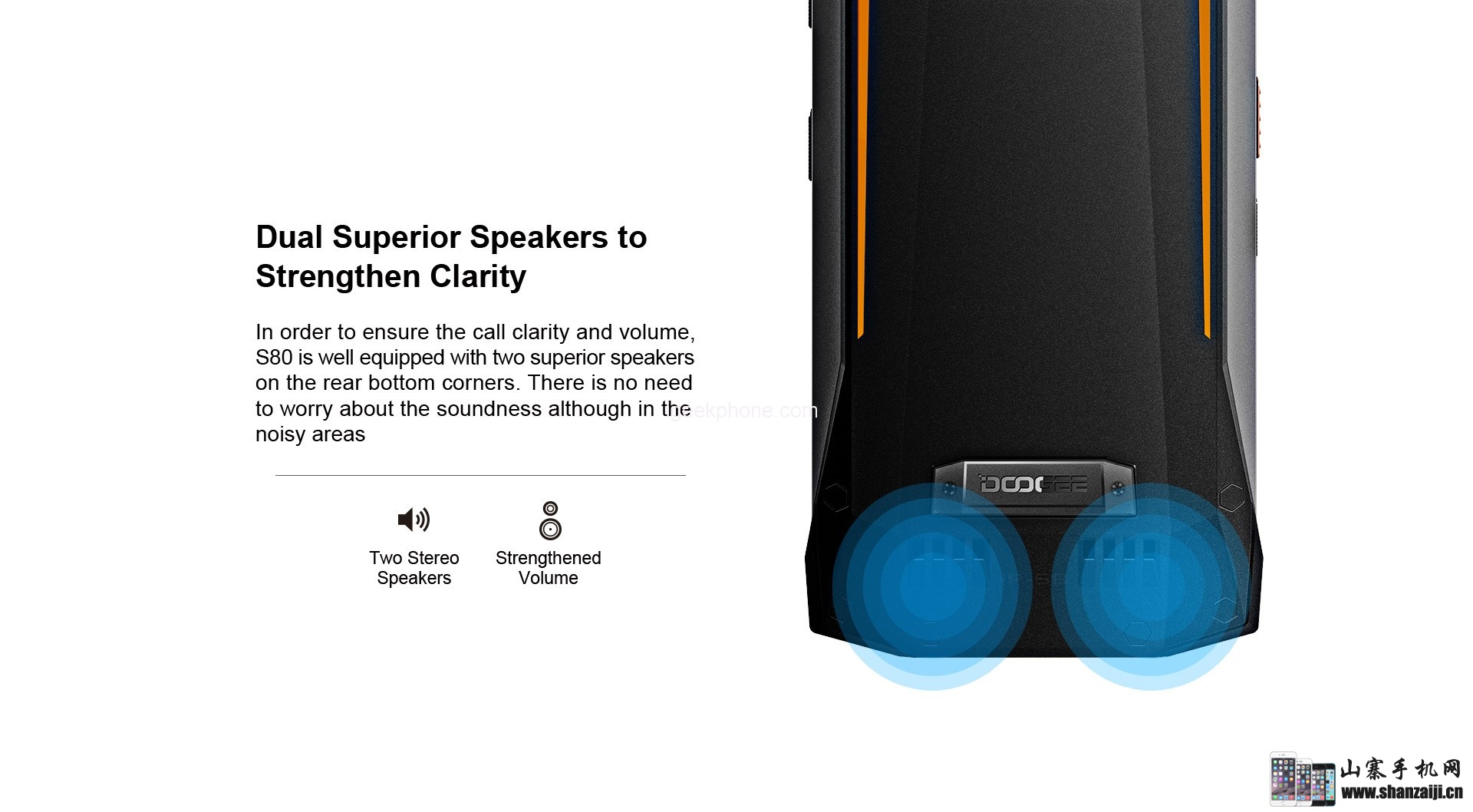 Doogee S80配备立体声扬声器。有指纹扫描仪,支持NFC,有指南针,气压计和手电筒。