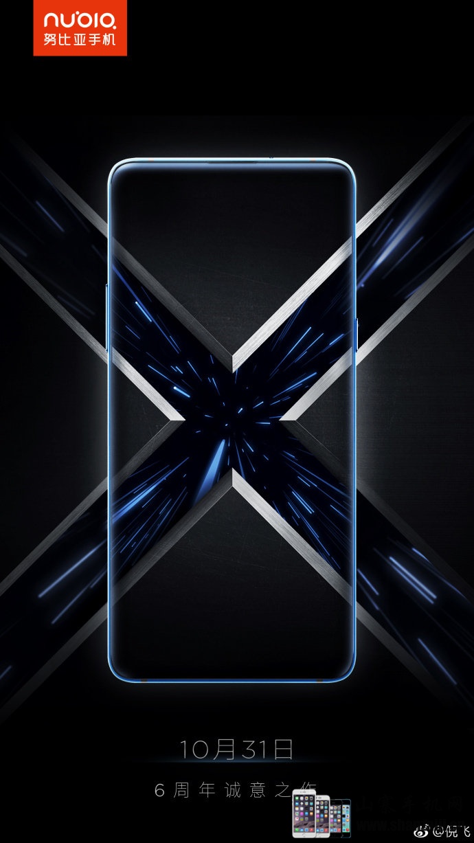 9月初,有传言说Nubia将推出一款采用双屏设计的新款智能手机。 当时,人们认为那是Nubia N18s。 如你所知,一款前后两个屏幕的神秘手机通过入网申请,型号名称为NX616J。 直到今天下午,我们一直认为这两款手机被认为是同一型号。 努比亚智能手机总经理倪飞通过微博发布了一张海报,并称其为努比亚六周年纪念。 此外,它还是迄今为止屏占比最大的智能手机。 正如你所看到的那样,正如海报暗示的那样,它是Nubia X.与此同时,海报显示即将推出的手机将于10月31日曝光。
